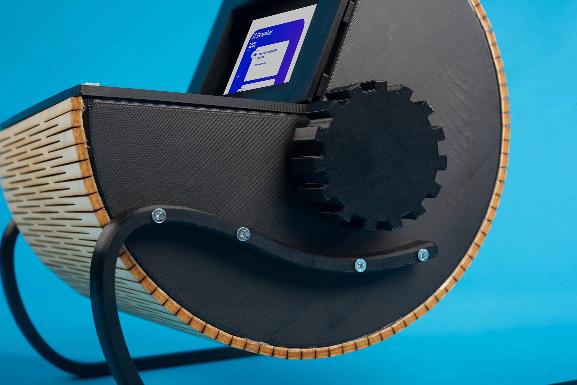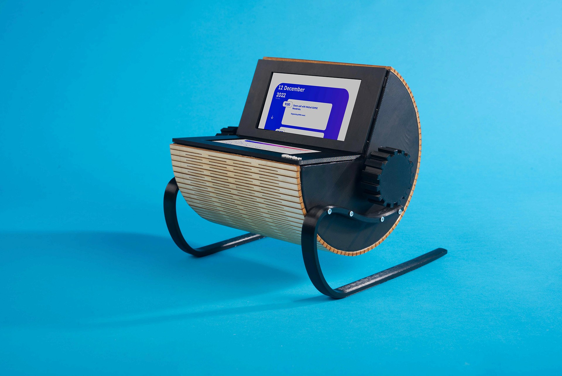 This physical object is designed with two rotary systems and two screens. The upper screen allows the user to see every single day and the details of the different appointments on that day, whereas the lower screen shows an overview of the entire week. The rotary system on the left side permits scrolling vertically to see the content of a single day. The rotary system on the right side allows the user to switch between dates horizontally.